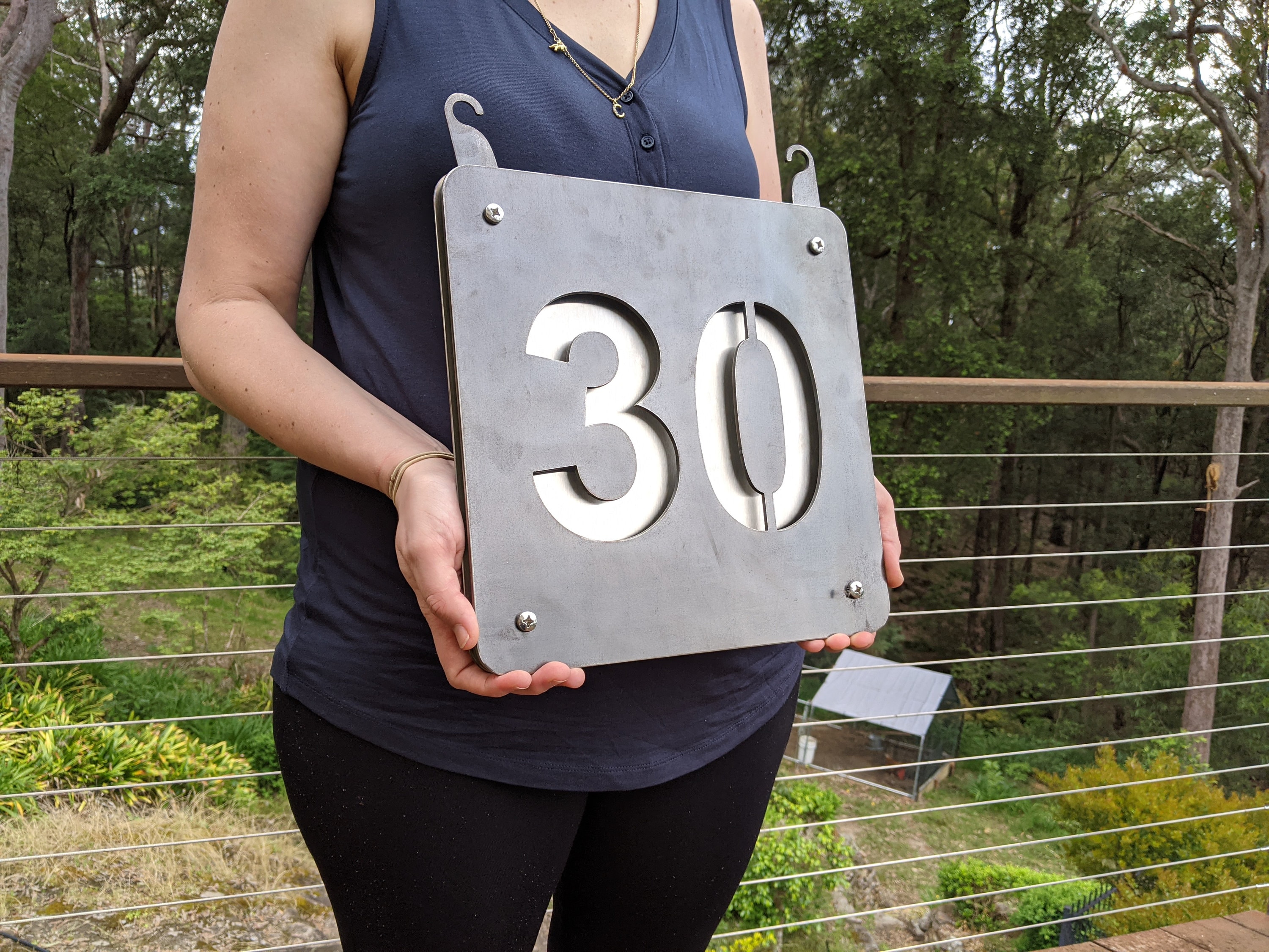 Extra Hole in Stainless Steel – Additional holes drilled into stainless steel backing, so that the backing can be mounted to a posts, trees, fences, etc. Then the front sign can be attached afterwards.